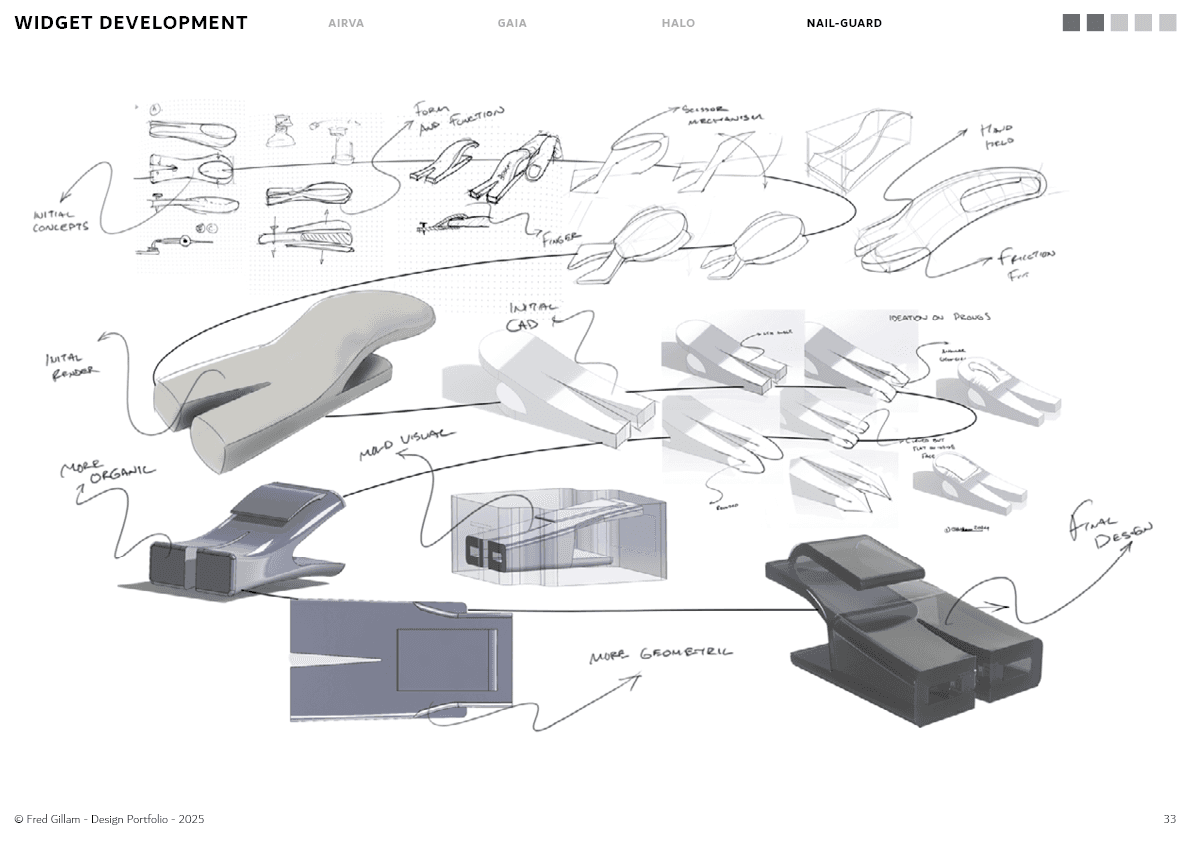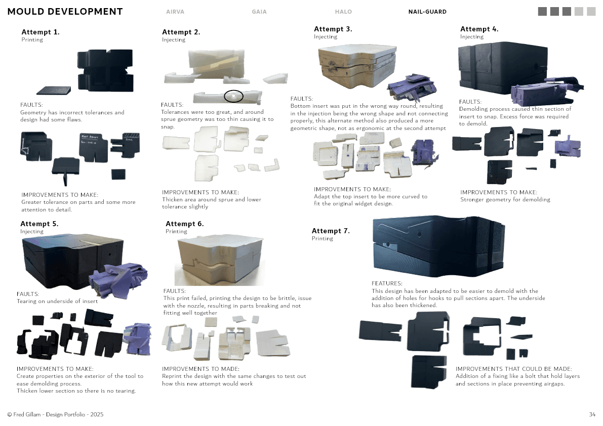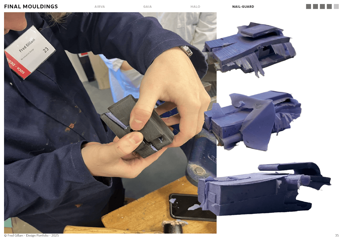 The project progressed through a highly iterative, hands-on process, with a strong focus on prototyping and manufacturing. Early concepts explored different forms and mechanisms to securely hold nails while remaining easy to use. Through multiple rounds of testing and refinement — particularly in mould design and injection processes, the design evolved to improve ergonomics, durability, and ease of demoulding.